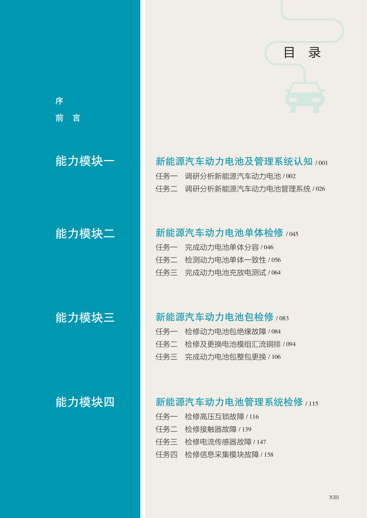 新能源汽车是国家战略性产业,产销量及出口量均居世界第一,但相关从业人才短缺,为满足行业企业对高素质技术技能人才的需求,本教材对接动力电池系统装调、检修、梯次利用等岗位,依据 “岗课赛证” 综合育人理念编写,旨在培养能进行新能源汽车动力电池及管理系统装调、检测与维修、梯次利用的高素质技能型人才。